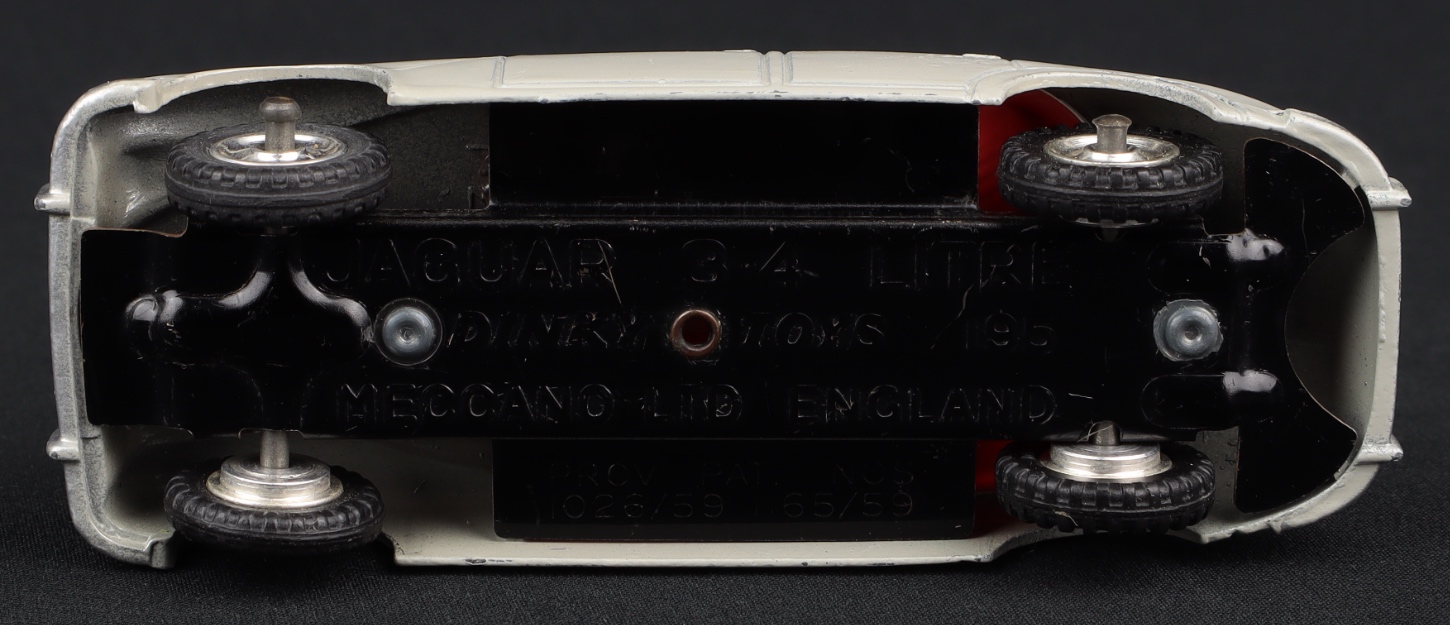 Jaguar 3.4 Saloon by Dinky Toys, No. 195. Pale grey issue with red interior, spun wheels. Very near mint/boxed. From The Eccles Collection.