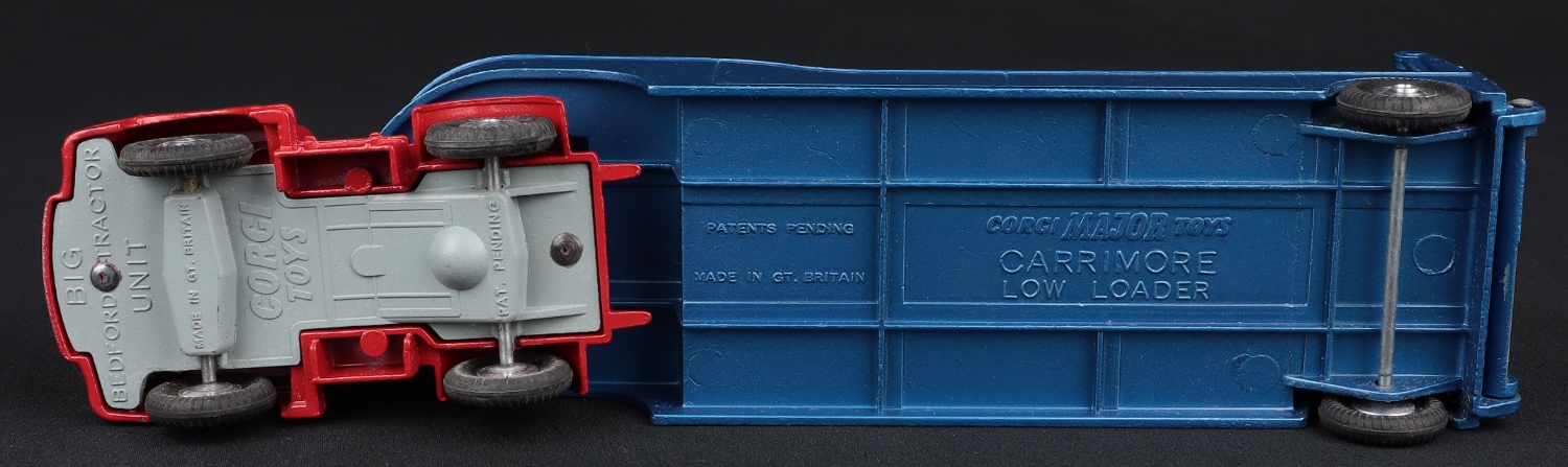 "Carrimore" Low Loader by Corgi Toys, No. 1100. Red cab issue with SHAPED spun wheels. Very near mint/boxed, with packing. From The Elmer Collection.