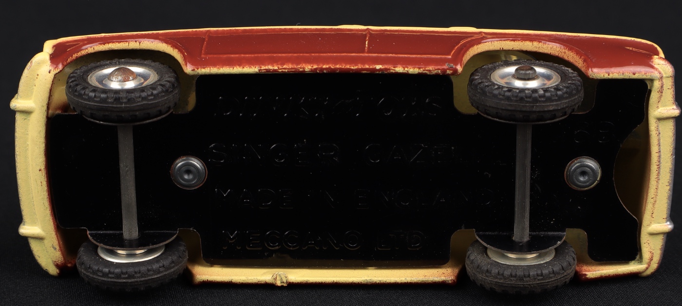 A classic Dinky Singer Gazelle saloon car in two-tone brown and cream finish. Issued between 1959-63, this model has a rich lustre to the paint finish, shiny shaped spun wheels, a bright base and as-new ridged tyres. In very close to mint condition.