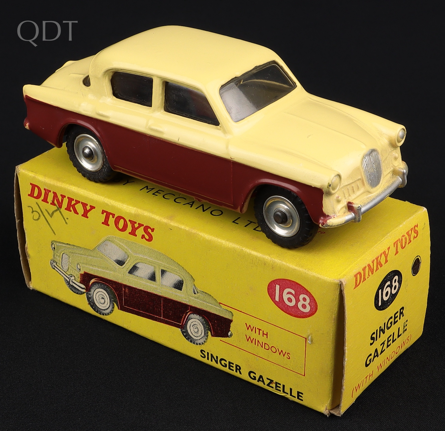 Singer Gazelle by Dinky Toys, No. 168. Brown & cream issue. Very near mint/boxed. Correct colour spot. Scarce LIGHTER YELLOW (later) PICTURE BOX. From The Reference Collection.