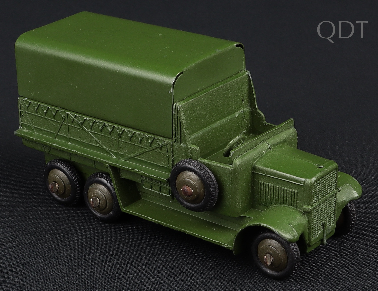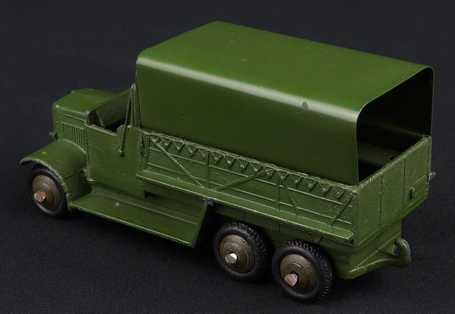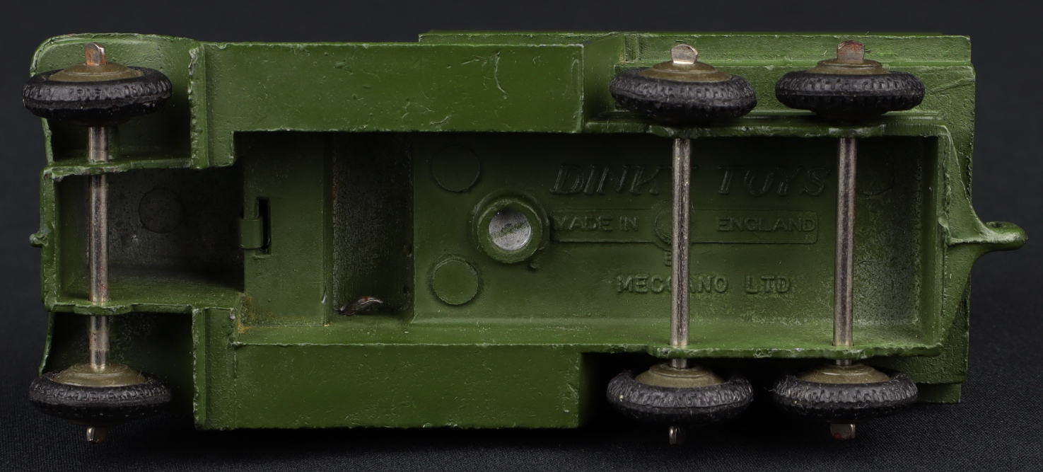 Intact and complete in matte military green, this impressive truck has ridged, well-shaped tyres and cast ridged wheels 0 a scarce find in khaki.