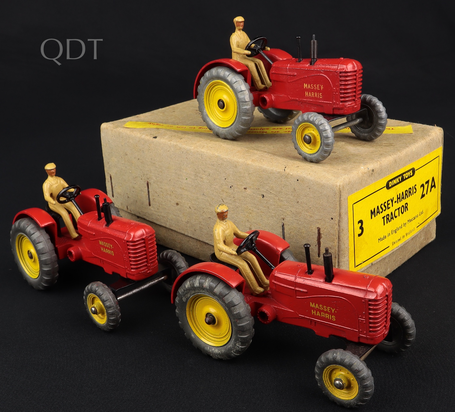 Trade Box of 3 x Dinky 27A Massey Harris Tractors. Near mint plus - very near mint/in original Dinky Trade Box. Scarce. From The Reference Collection. Starting bid £150. Please note that QDT apply 12.5% buyer's commission.
