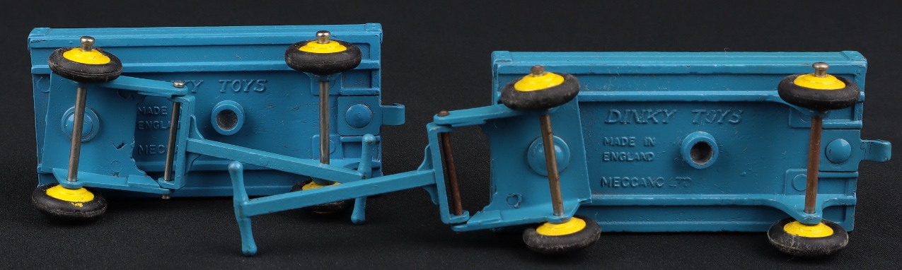 Issued during 1954 under this dual-numbering, this is an old shop stock cache of 6 x Dinky 105C Garden Truck in blue, with yellow cast wheels. Smooth original black tyres (one tyre has a light flat spot).