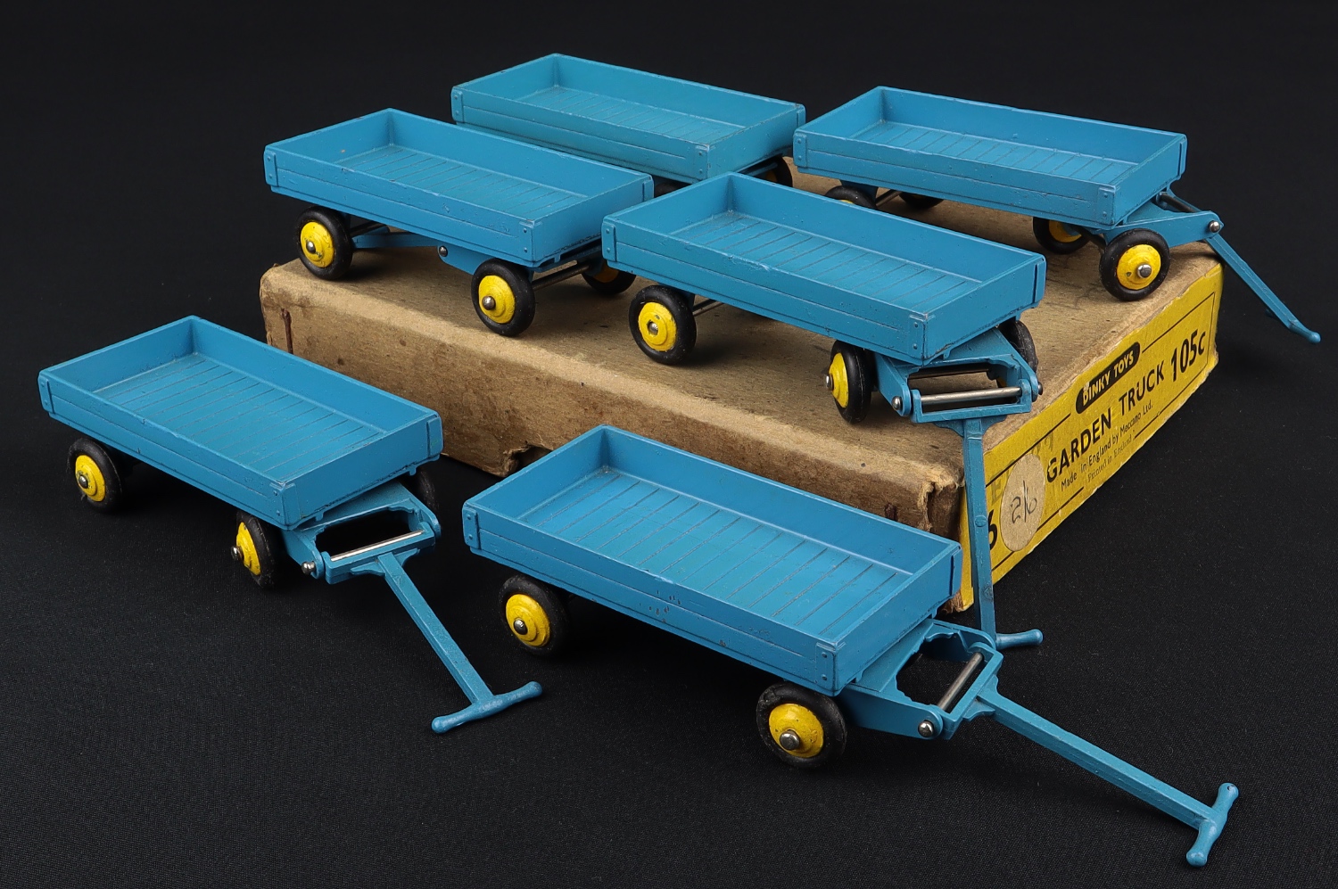 6 x Garden Trucks in original Trade Box, Dinky Toys No. 105C. Near mint plus - very near mint. With original card dividers. Scarce old shop stock item from The Reference Collection. Starting bid £150. Please note that QDT apply 12.5% buyer's commission.