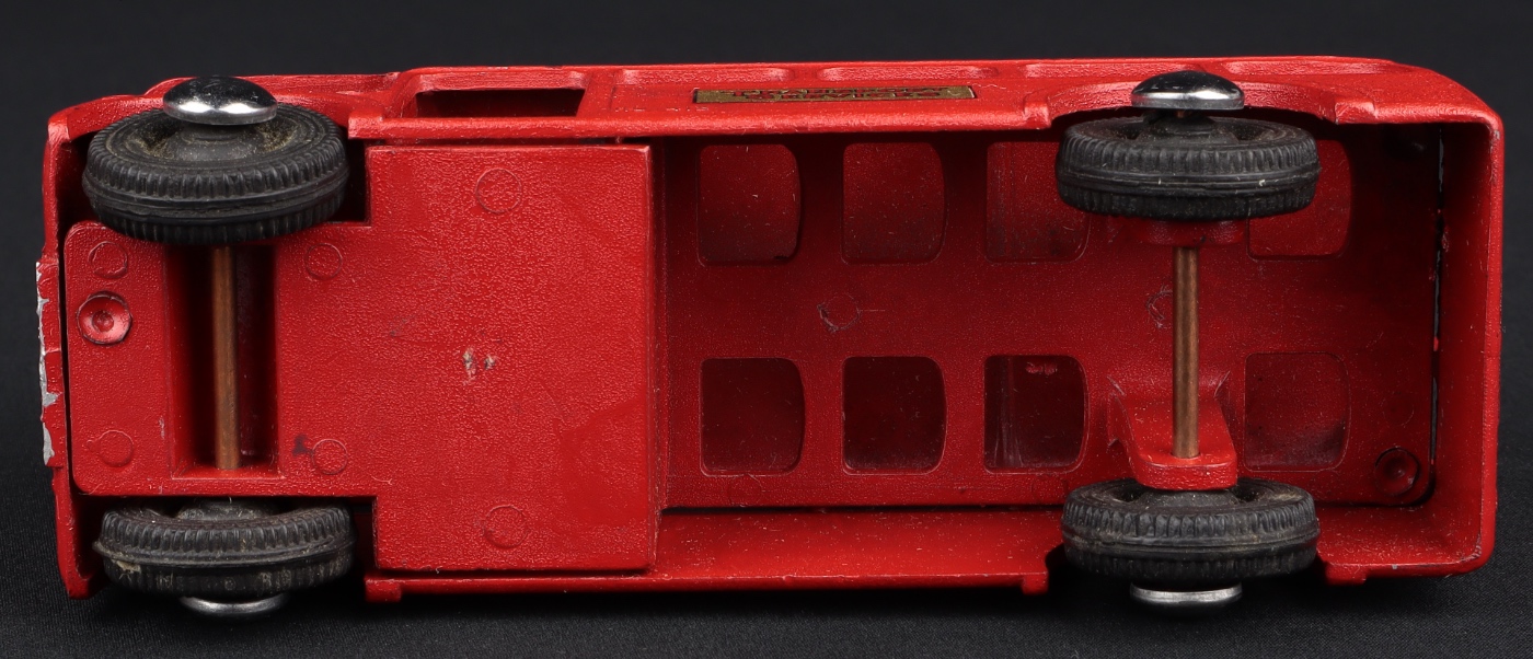 Circa 1950. From a small company about which relatively little is known, comes this very fine Motor Bus in very close to mint condition in vivid red (somewhat ‘orange peel texture now). Bright and complete ’TRANSPORT SERVICES’ on both sides. Shiny wheels and well-shaped treaded tyres.