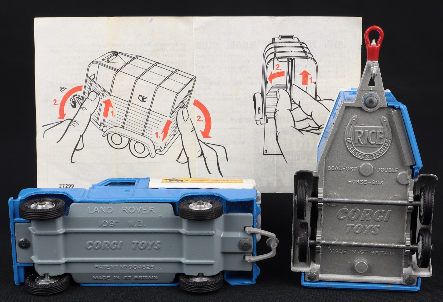 Land-Rover And Rice's Beaufort Double Horse Box with mare & foal by Corgi Toys, Gift Set No. 15. Transition issue with combination of different wheel types. Very near mint/boxed, with card insert, leaflet & card packing. From The Elmer Collection.