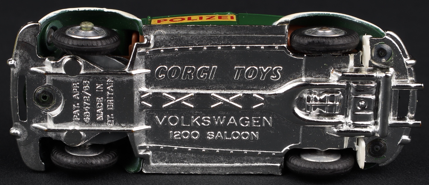 Volkswagen 1200 Police by Corgi Toys, No. 373. Scarce with WHITE BASE & BUMPERS and Rally whizzwheels. Very near mint/boxed.