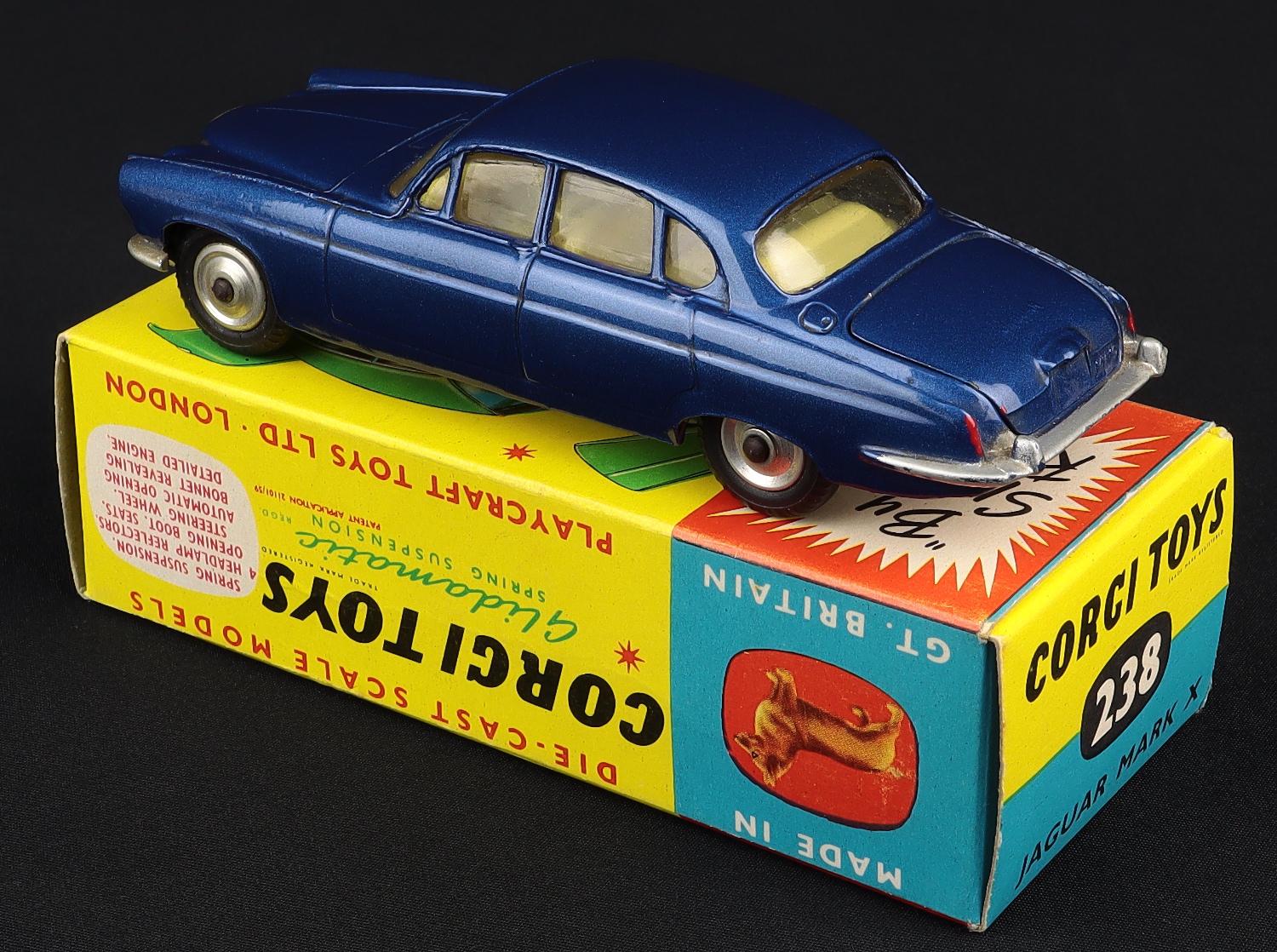 Jaguar Mark X by Corgi Toys, No. 238. Scarce in MID-METALLIC BLUE with LEMON INTERIOR, shaped spun wheels.Very near mint/boxed. With both suitcases. Scarce model from The Eccles Collection. Starting bid £250. Please note that QDT apply 12.5% buyer's commission.