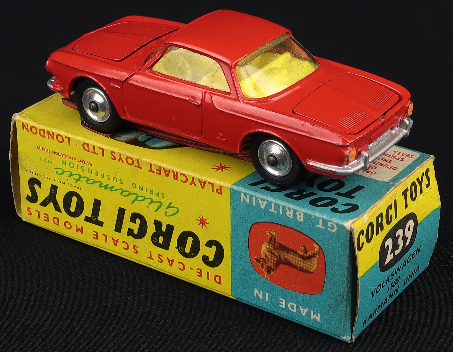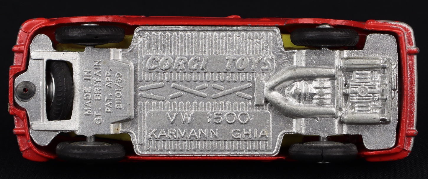 Volkswagen 1500 Karmann Ghia by Corgi Toys, No. 239. Scarlet red issue with lemon interior, with spare wheel & luggage. Near mint plus/boxed. From The Eccles Collection.