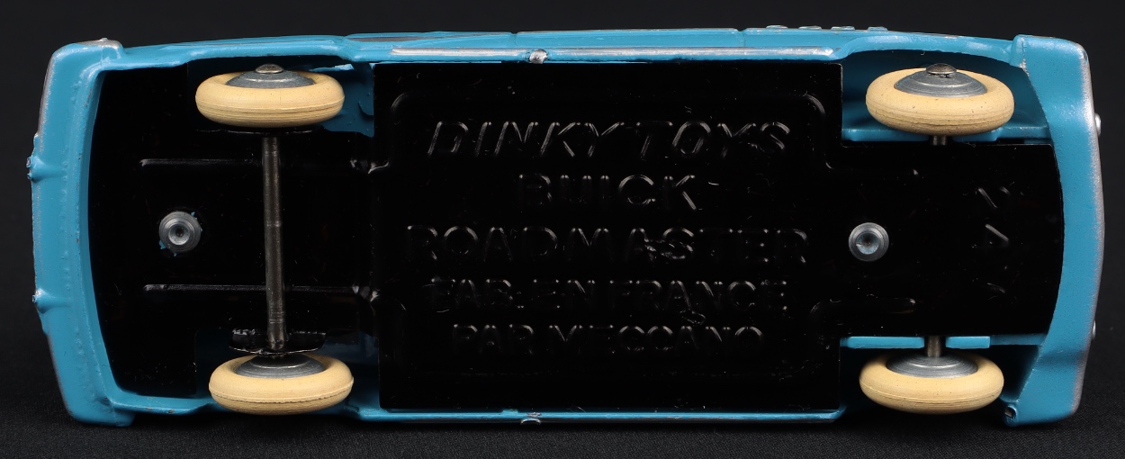 This is a scarce version of the handsome Buick model finished in deep sky blue with a midnight blue roof. This is an an early issue (1954-56) and a most unusual find with original convex wheels in silver-blue. Early issue so no cross-hatching on the roof interior.