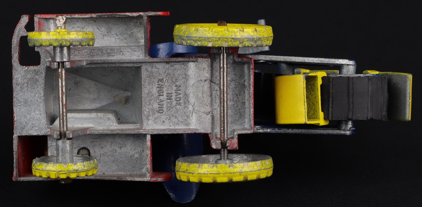 Vivid red finish with one-piece yellow metal wheels/tyres. Working conveyor belt function. Seated fawn metal driver.