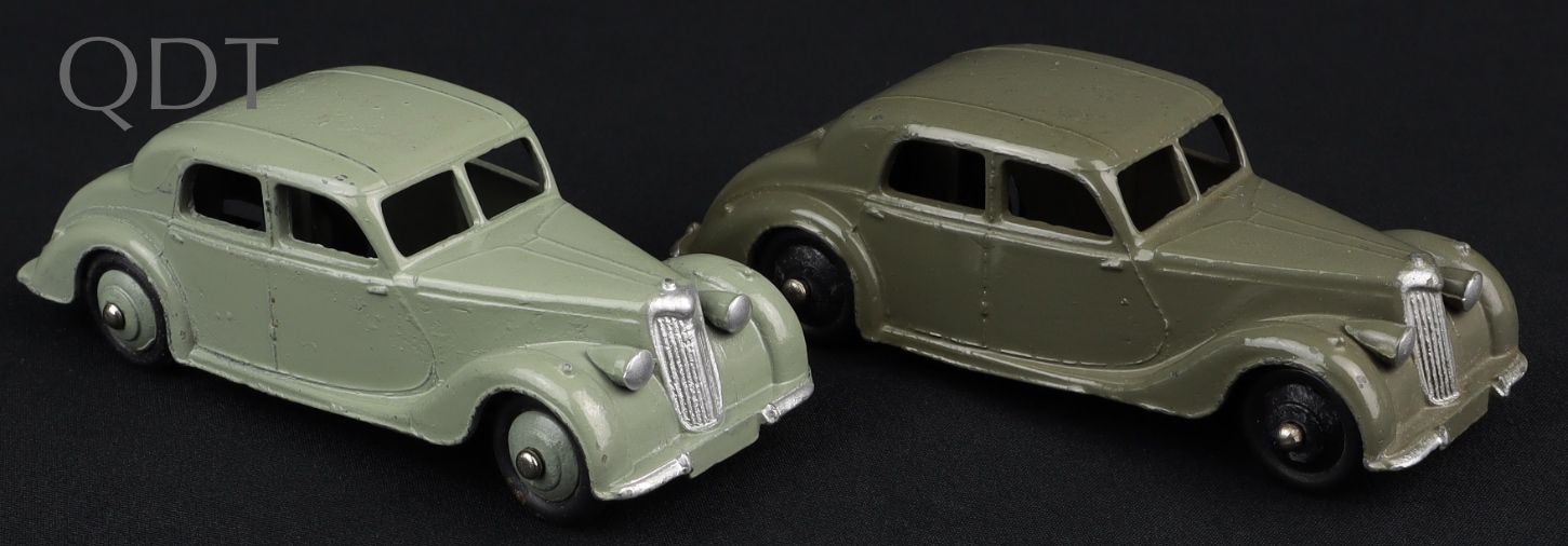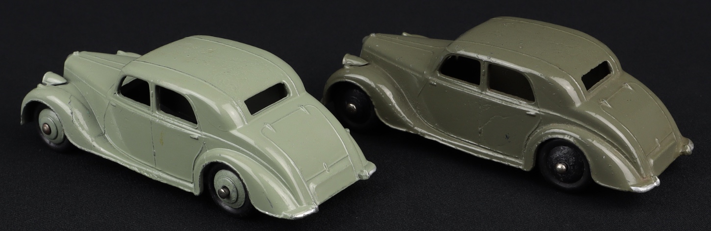 2 x Riley Saloons by Dinky Toys, No. 40A. Very scarce early issue in LIGHT GREY with MATCHING WHEELS & DEEP GREY with BLACK WHEELS. Near mint plus - very near mint/never boxed individually. QDT starting bid £175. Please note that QDT apply 12.5% buyer's commission