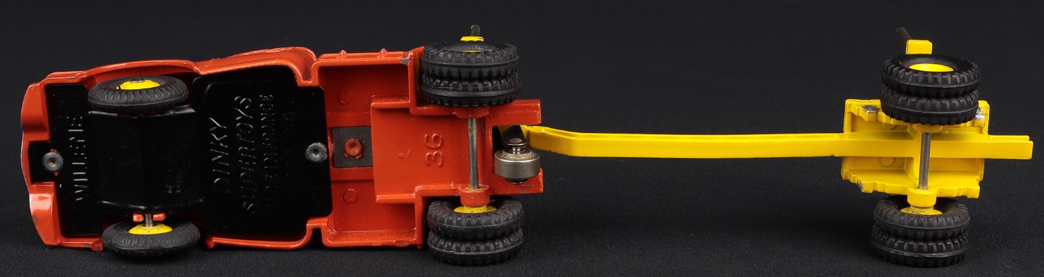 This Willeme Log Carrier Truck is finished in vibrant orange and deep yellow. Note the pierced detailing of the beam beneath the logs (later issues unpierced), so an early issue. Also, note the cast cab wheels, later issues would have concave wheels. Couple of negligible marks and a little super-detailing in silver near the rear wheels. Complete with the* full log load and the four metal pins*. Spare wheel.
