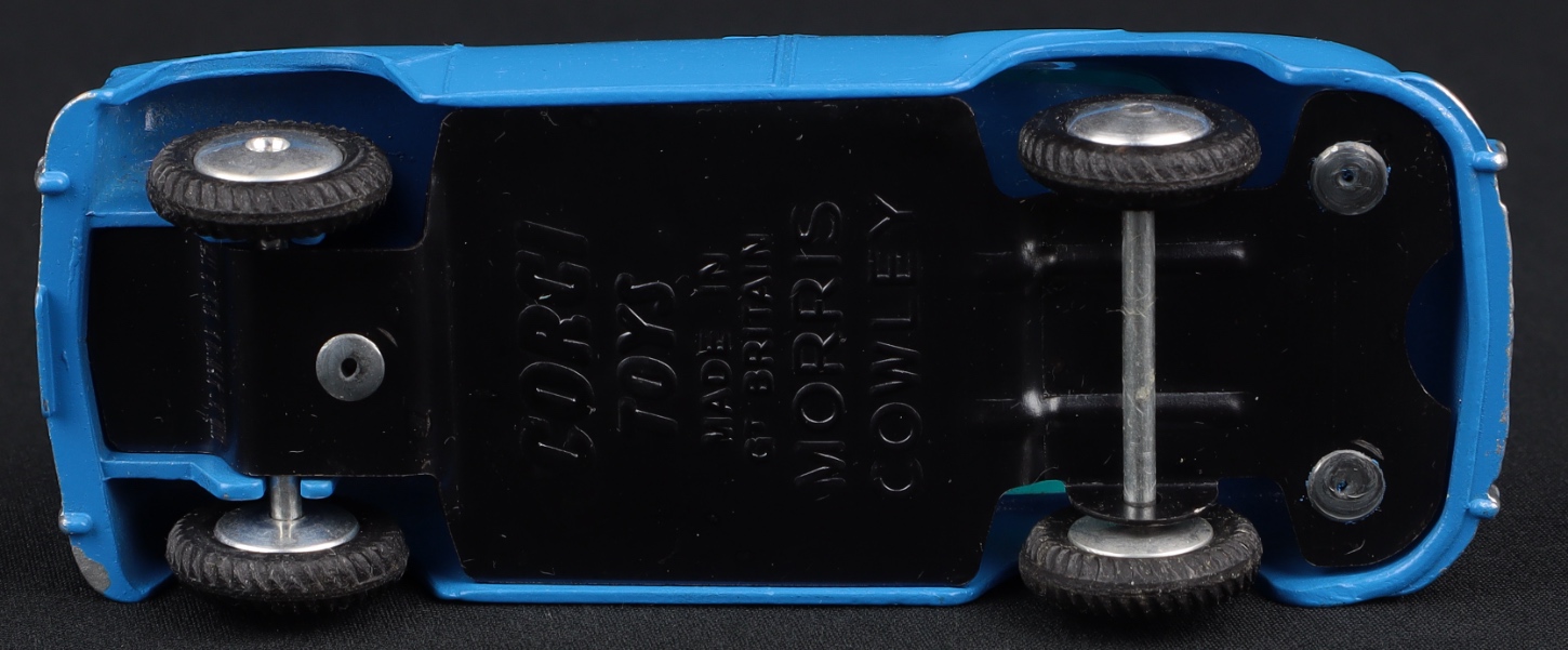 This early Corgi car has a day-one bright and lustrous original paint finish in eye-catching bright blue, with shiny flat spun wheels. Blue-tinted window glazing. Fine original treaded tyres. Bright baseplate.