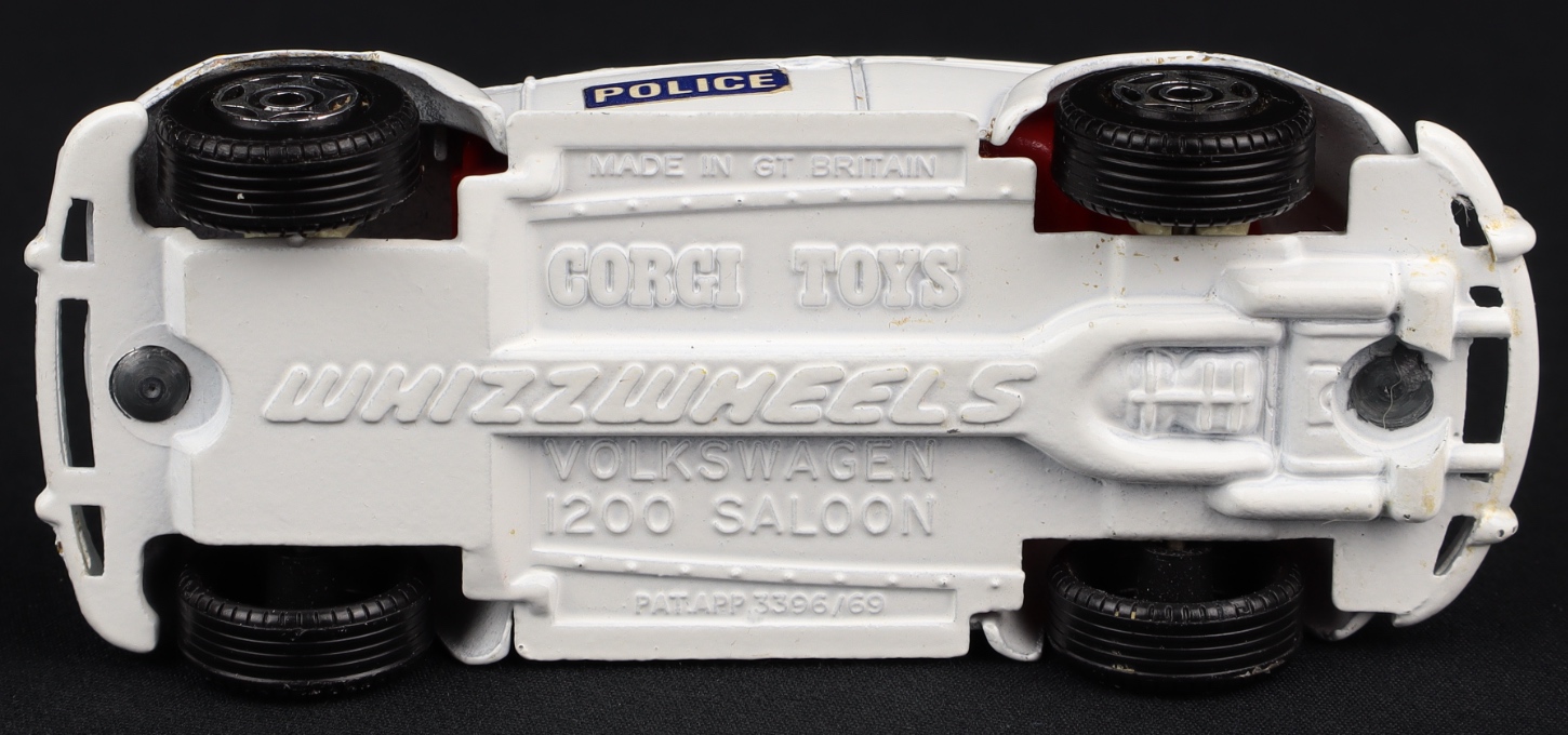 Volkswagen 1200 Police by Corgi Toys, No. 373. Scarce with WHITE BASE & BUMPERS and Rally whizzwheels. Very near mint/boxed.