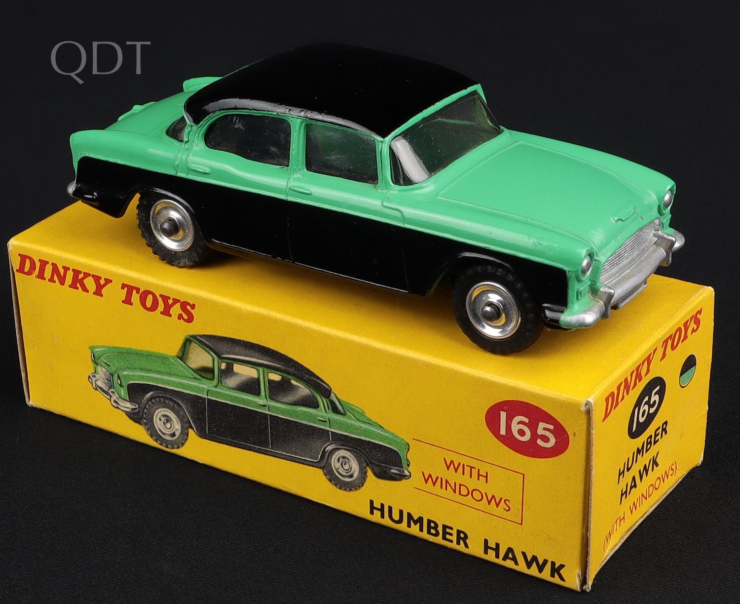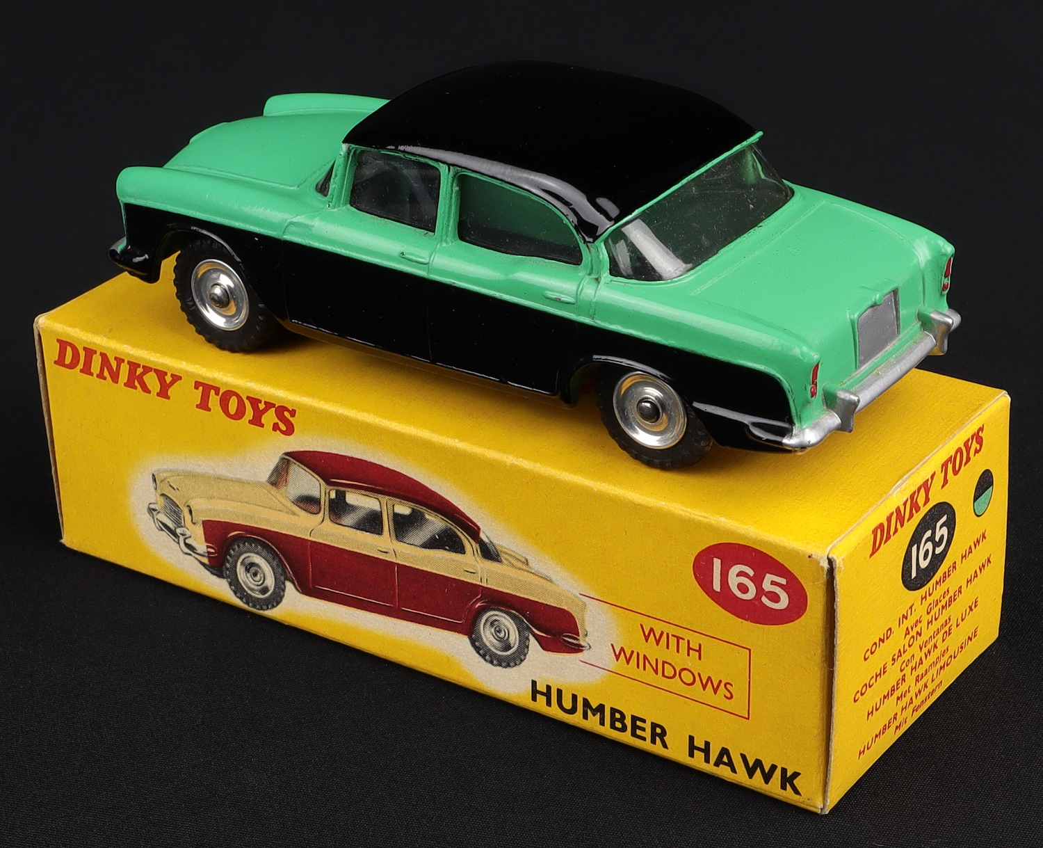 Humber Hawk by Dinky Toys, No. 165. Scarce version WITH front number plate casting. Very, very near mint/boxed.