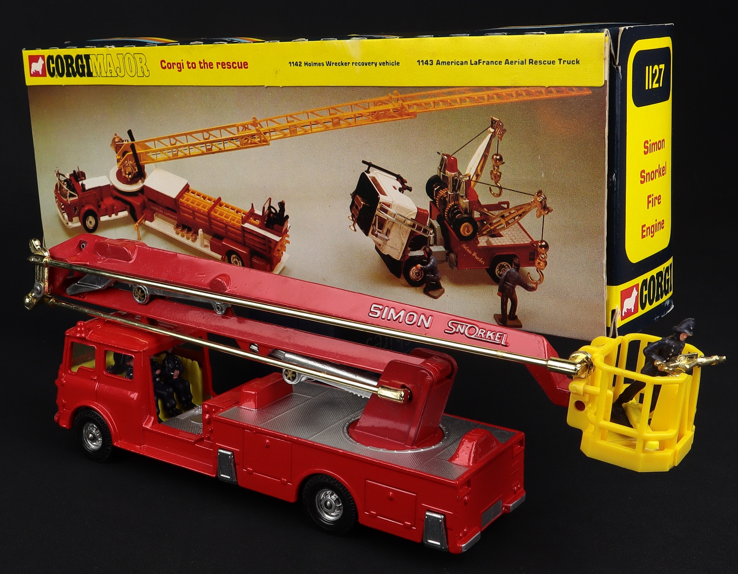 Simon Snorkel Fire Engine by Corgi Toys, No. 1127. Very, very near mint/boxed. Scarce late version with 8-spoke cast one-piece wheels & tyres. Late issue card and cellophane picture box. With all 3 polystyrene packing pieces. From The Elmer Collection.