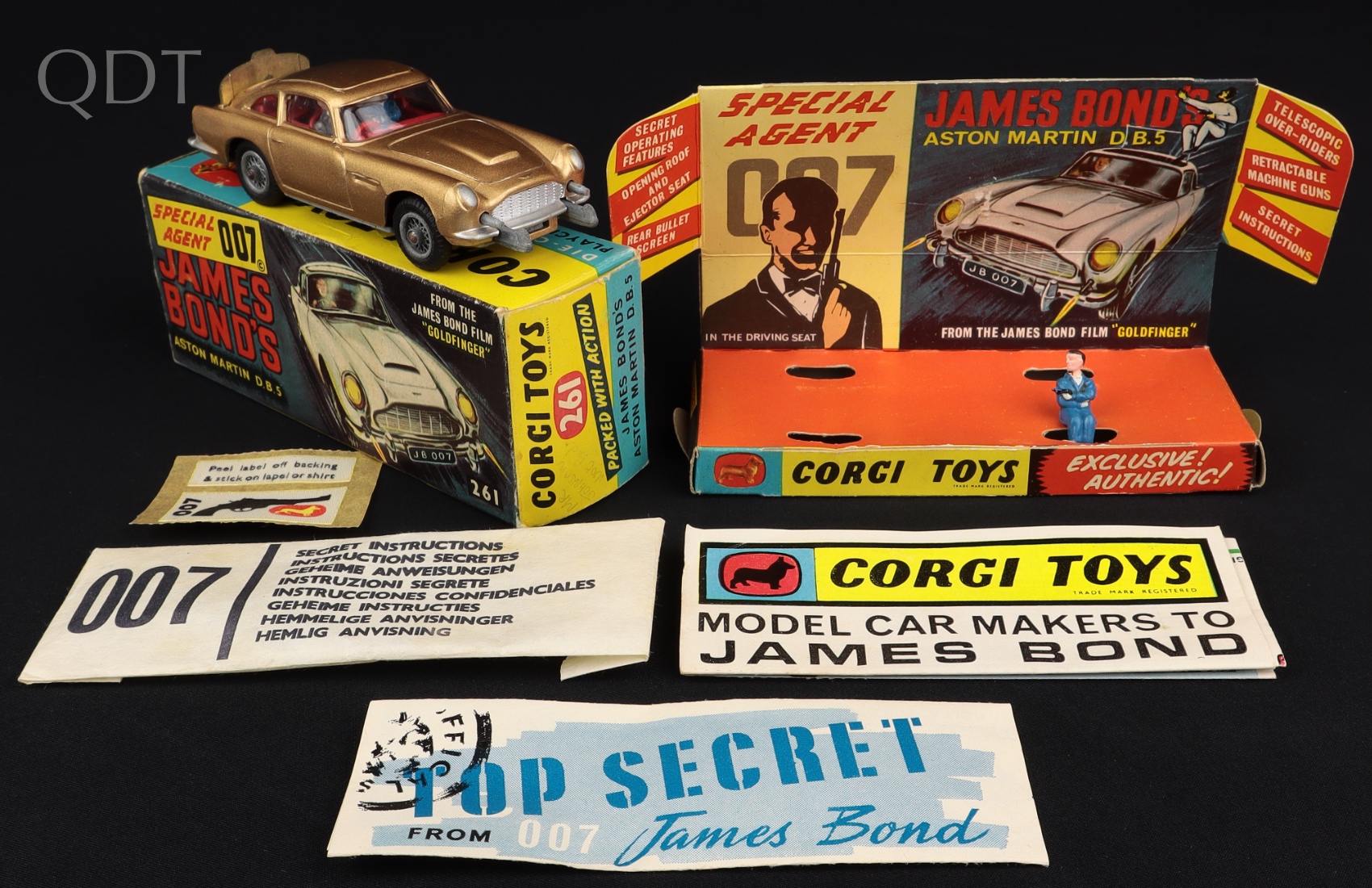 James Bond's Aston Martin D.B.5 by Corgi Toys, No. 261. Very near mint/boxed. 2nd issue. Version WITHOUT INDICATOR LIGHT CASTING. With FULL Secret Instruction Packet & 'Model Car Makers to James Bond' Leaflet. 2nd issue box.