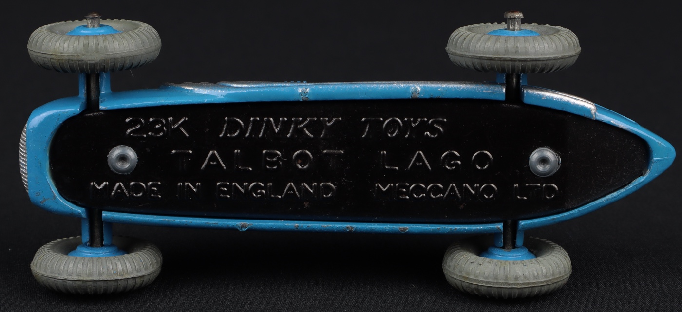 Talbot-Lago Racing Car by Dinky Toys, No. 23K 230. Blue with blue cast wheels issue. Very near mint/boxed. From 1954 with 23K on the base and dual-numbered box.