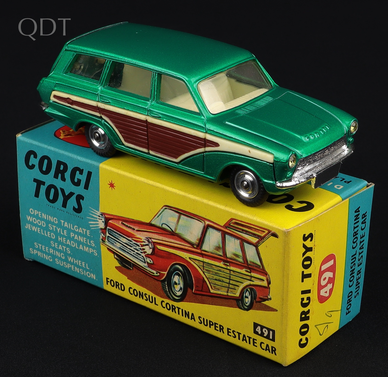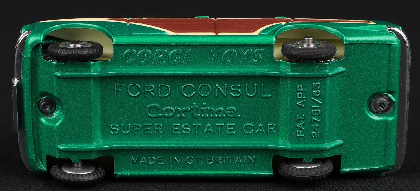 Factory Colour Trial Ford Consul Cortina Super Estate Car by Corgi Toys, No. 491. In METALLIC GREEN with brown & cream side panels. A unique item from The Gower Collection. Starting bid £500. Please note that QDT apply 12.5% buyer's commission.