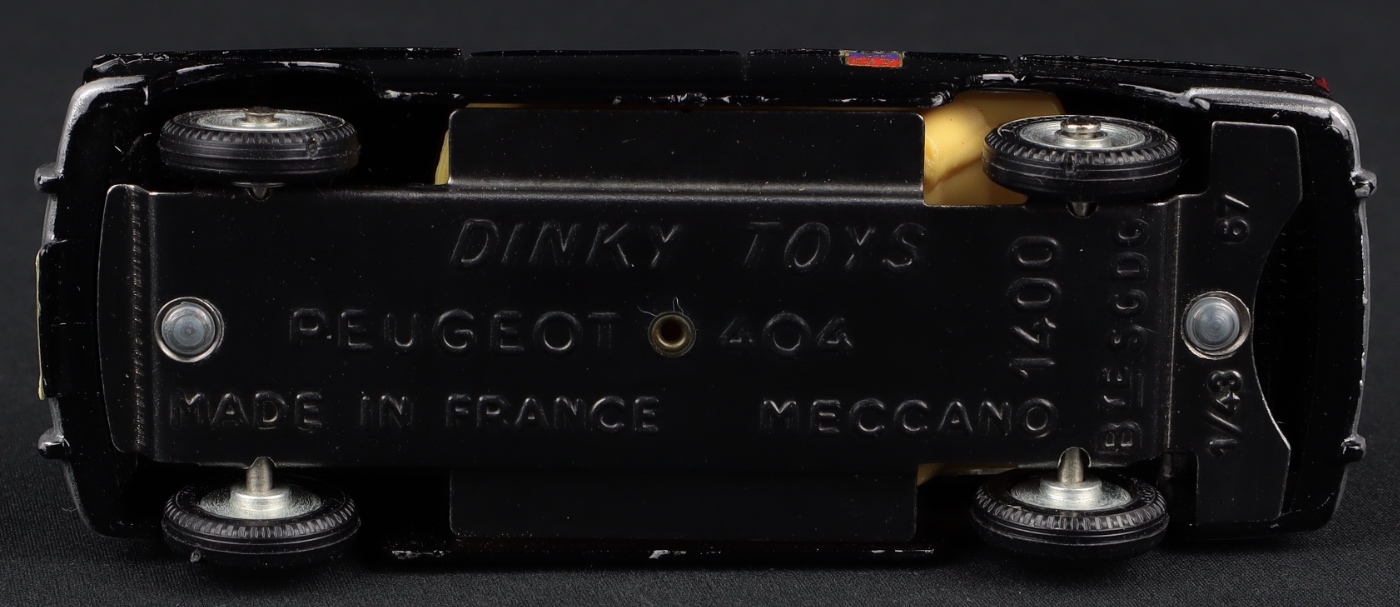Peugeot 404 G7 Taxi by French Dinky Toys, No. 1400. With anodised wheels. Very near mint /boxed with aerial in original packet. Rare. From The Heart of England Collection.