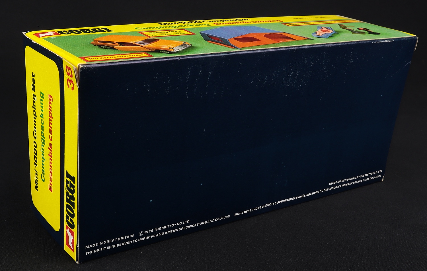 Old shop stock find. This boxed set has just been removed from a Trade Pack for these images. Issued between 1977-78, this charming Gift Set comprises a beautiful cream Mini, along with a blue and orange plastic tent with a yellow card packing piece and figures enclosed in a clear intact bubble.