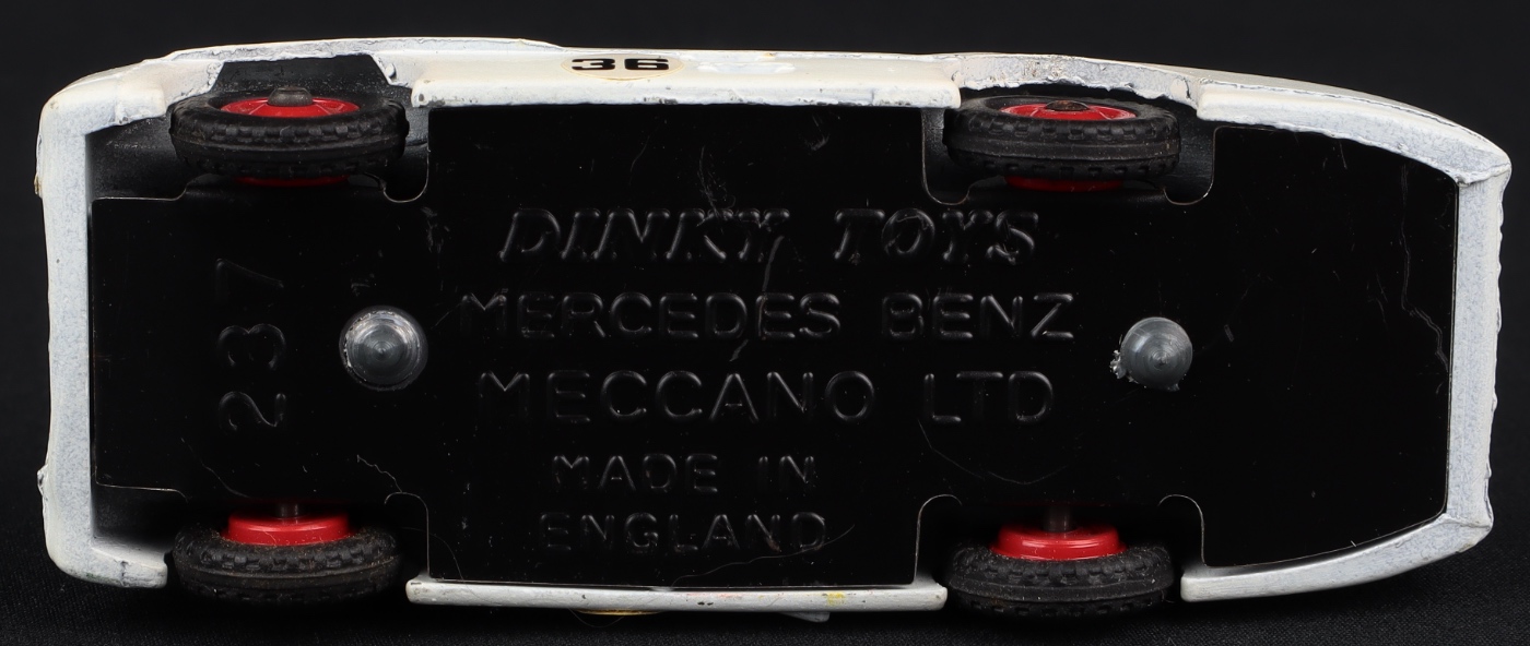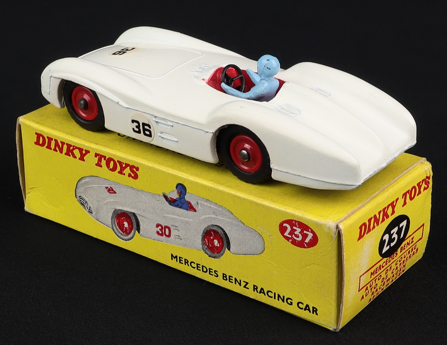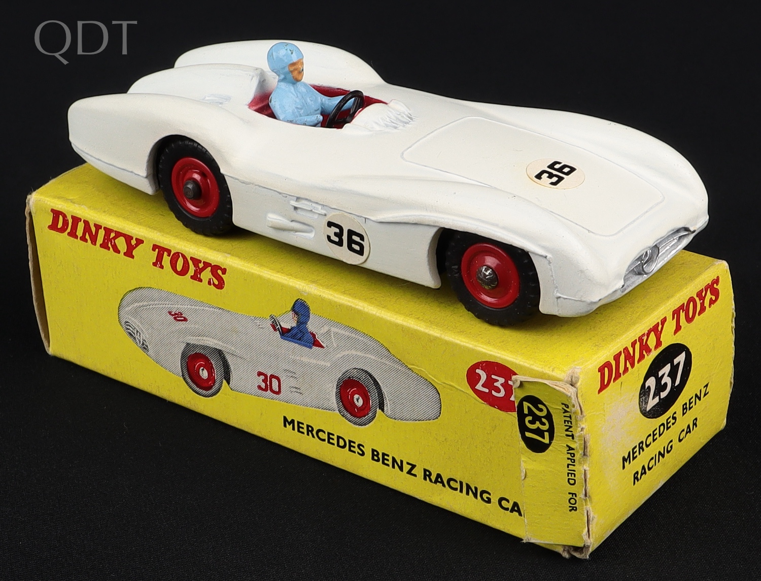 Mercedes Benz Racing Car by Dinky Toys, No. 237. Rare version in MATT WHITE with red plastic wheels, PAPER RACING NUMBER LABELS 36, blue metal driver, black plastic steering wheel. Very, very near mint/boxed. From The Rickman Collection.