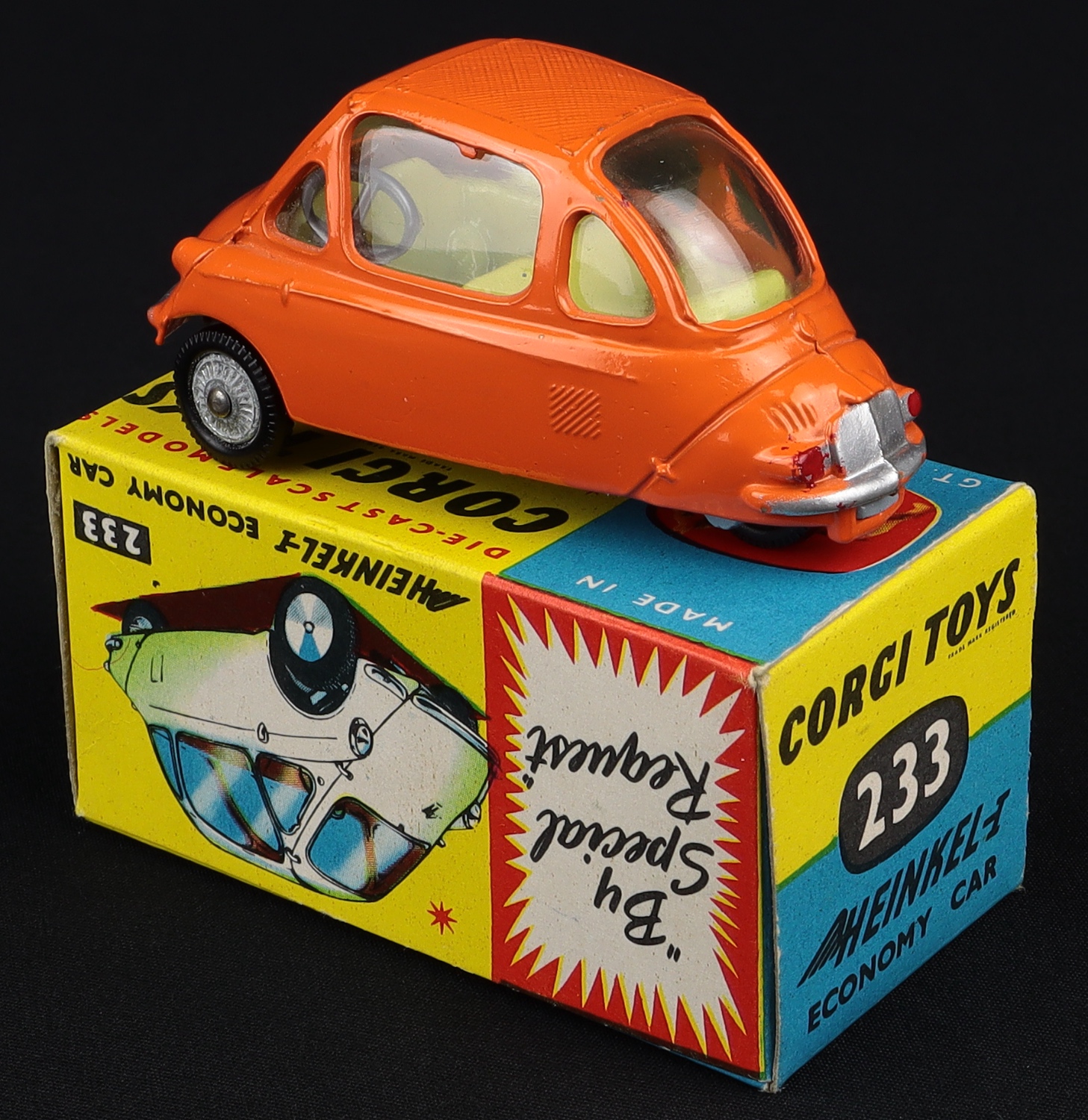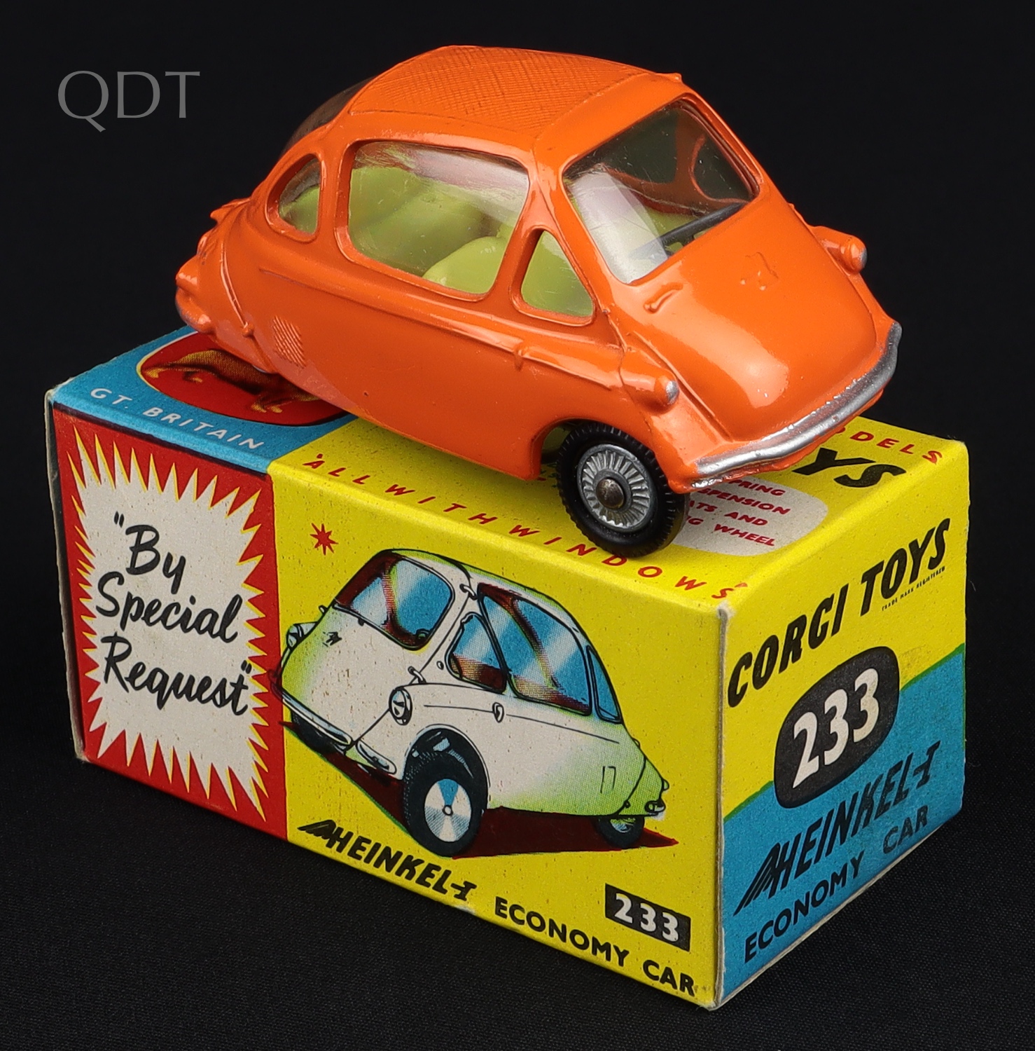 Heinkel Economy Car by Corgi Toys, No. 233. Cast wheels. Orange. Very near mint/boxed. Nice box! From The Elmer Collection.