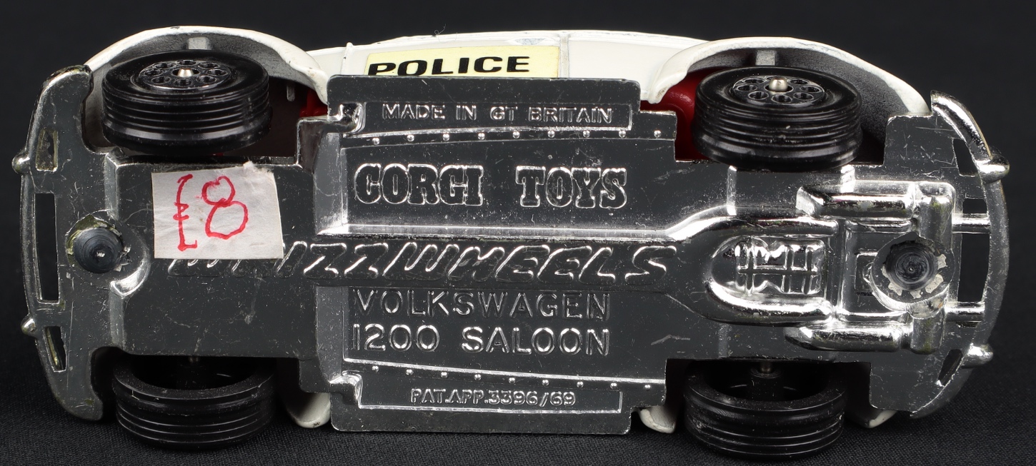 Volkswagen 1200 Police by Corgi Toys, No. 373. Very near mint with early black lettering on LUMINOUS label, Whizzwheels/boxed (later version). With Leaflet. From The Elmer Collection.