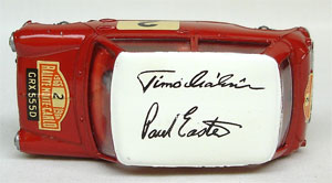 5) Corgi 321 Austin Mini-Cooper in red with roof signatures of Timo Makinen and Paul Easter. Another very desirable Corgi car in sparkling very near mint condition! Complete transfers all-round (not even a centre-line rub on the bonnet transfer!). All four jewelled lights and no rubbing to the crisp and clean all-important roof signatures.