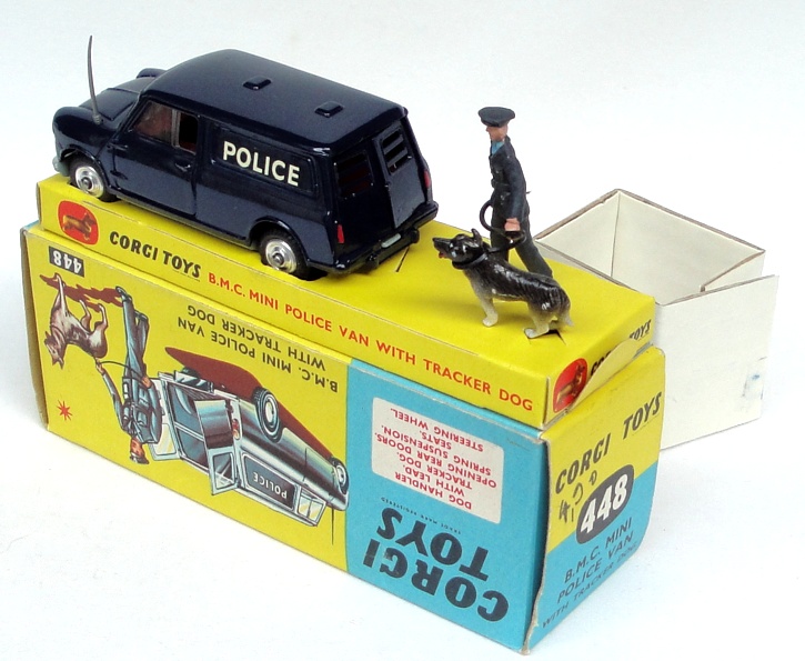 Corgi 448 B.M.C. Mini Police Van with Tracker Dog. Scarce version in blue-black with a simpler card plinth. Very, very near mint/boxed with packing piece. From the Italian collection.