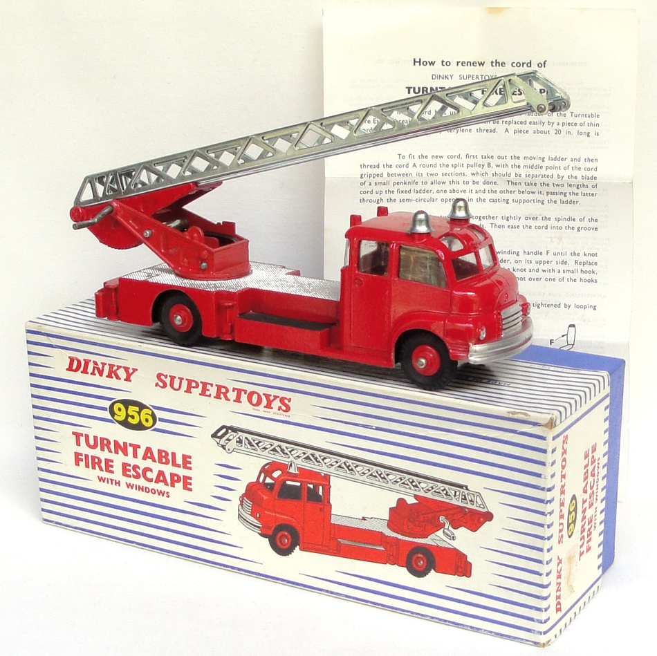 Dinky 956 Turntable Fire Escape. Very near mint(ladders never strung)boxed. Scarce issue with window glazing and plastic hubs. Last issue with no winding handle cuffs. Complete with all 3 packing pieces and Instruction Leaflet. From the 1200 model Italian collection.